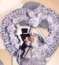 Brautpaar mit blumenverziertem Herzkranz und Tüll