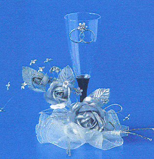 Tortenaufsatz zur silbernen Hochzeit mit Sektglas und silbernem Blumenornament und silbernen Ringen